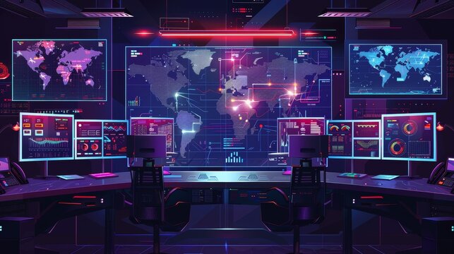 A dark control room features a chair facing orange-lit monitors displaying a world map, creating a futuristic and tense atmosphere.