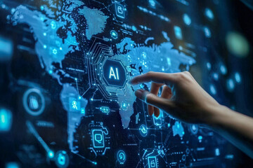 Hand is touching the AI icon on an electronic screen with a digital world map background and a purple light effect.