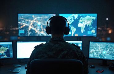 Military surveillance officer monitors city operations for cyber control, national security. Man wearing headphones, analyzing data, intelligence reports on computer screens. Cybersecurity, defense,