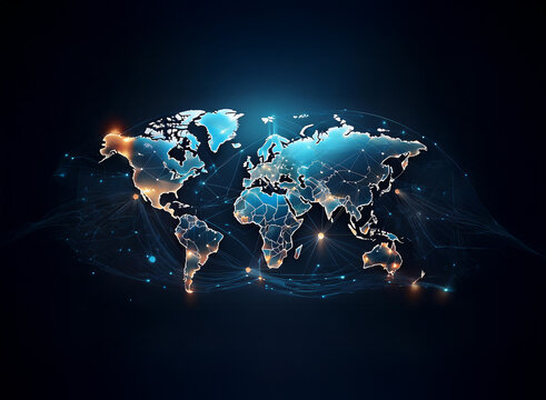 business abstract global connectivity and data network visualization with digital world map, corporate technology infrastructure, and modern international strategy concept
