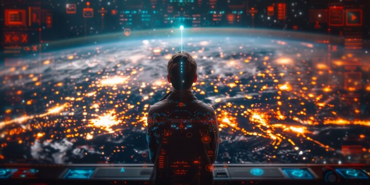 Silhouette of a person standing before a futuristic screen displaying Earth at night with glowing city lights and digital interface elements