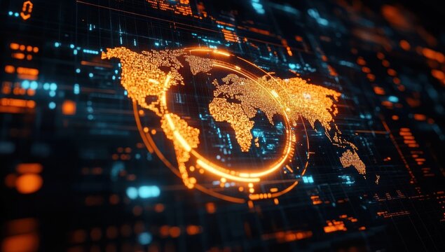 Futuristic digital world map glowing in orange with circular data visualization and high-tech interface elements on dark background
