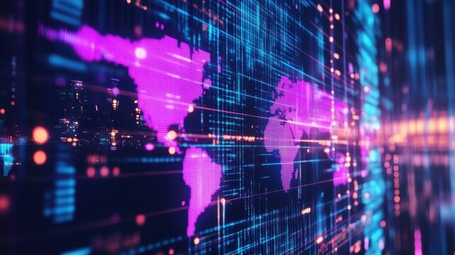 Abstract Futuristic digital world map with pixelated continents and flowing data streams, visualizing global communication and information exchange