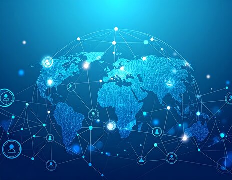 Global digital network connection concept with glowing user icons and Earth from space on dark blue background with futuristic technology light dots.