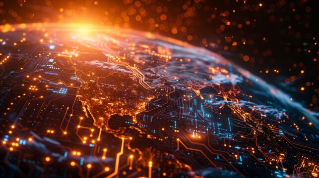 glowing digital map of world with dynamic connections highlights global trade networks and technological advancements. vibrant orange lines and nodes create futuristic and interconnected visual