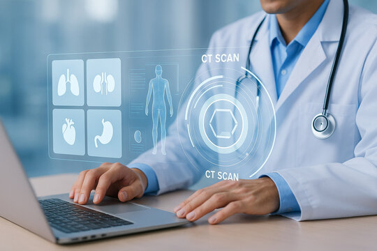 AI generated doctor using laptop while interacting with transparent holographic interface showing CT scan data human anatomy and organ icons in a clean futuristic medical workspace