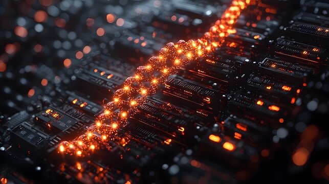 Glowing DNA inspired bridge connecting digital hardware components