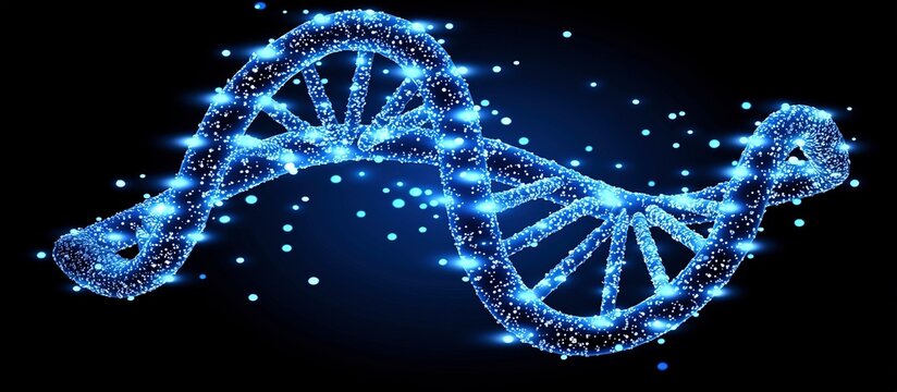 A glowing digital representation of a DNA double helix structure with connected nodes floating.