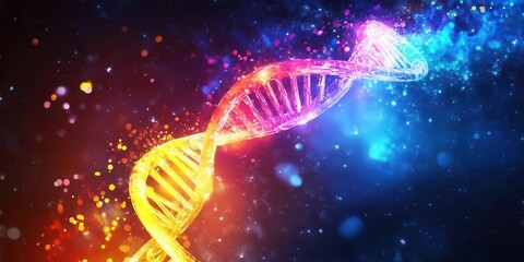 Vibrant DNA double helix with orange, pink, and blue nucleotides on dark background with glowing particles.