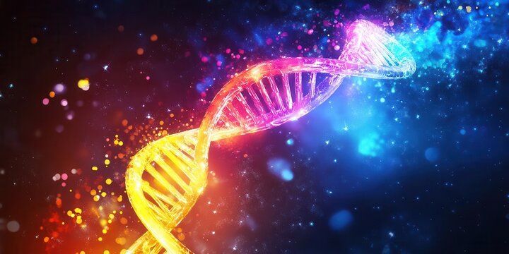 A vibrant depiction of a DNA double helix against a cosmic background.