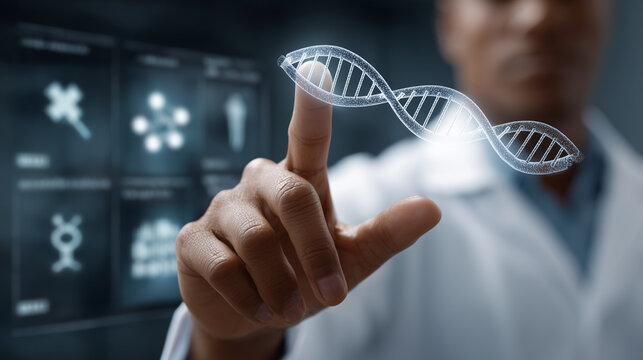 Scientist Manipulating Holographic DNA Sequence Interface with Genetic Information and Molecular Structures