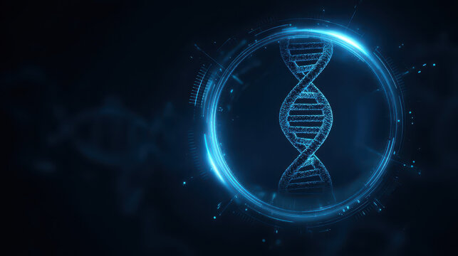 Futuristic biotechnology digital interface with dna strands, molecular structures, and scientific data visualization on high-tech blue background for advanced research and genetic engineering concepts