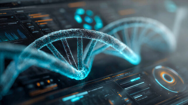Digital DNA strand visualization with futuristic interface and glowing elements in a scientific environment