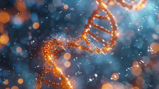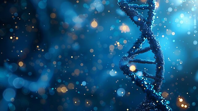 Beautiful spiral of blue DNA double helix with light bokeh and bubbles, gracefully floating on a blue background