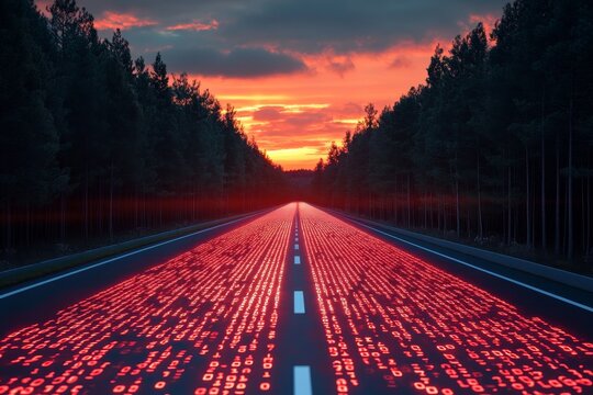 A highway encased in red binary code under a sunset, symbolizing digital technology and nature