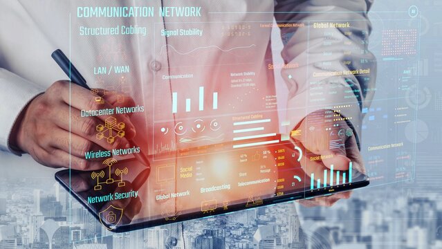 Data center monitoring dashboard visualize network performance, connection status, usage rate, and telecommunication insight. Data center monitoring efficiency improvement network transparency. Thunk