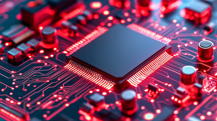 High tech circuit board with glowing red lights, featuring central processing unit and intricate pathways. design showcases modern technology