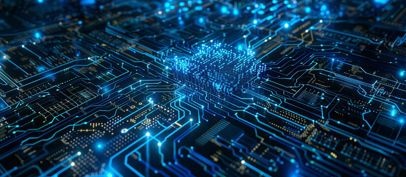 Futuristic digital circuit board with cyan glow