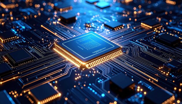 close-up of a glowing central microchip on a complex electronic circuit board with illuminated blue and orange lights and intricate connections