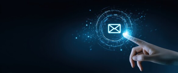 The hand reaching for a glowing email icon in a futuristic digital interface.