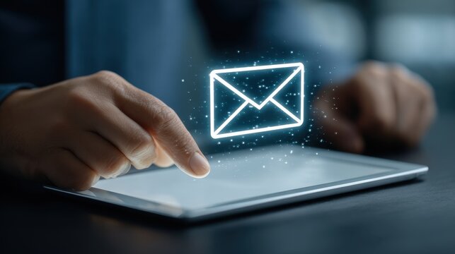 A person's finger touches a tablet displaying a glowing digital envelope icon with particles