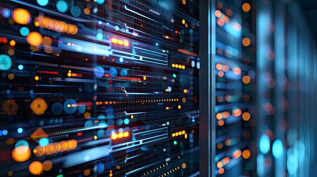 Encrypted data transfer in server room with digital overlay