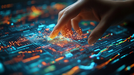 A hand touching a digital interface, showcasing vibrant data visualization and technology in action.