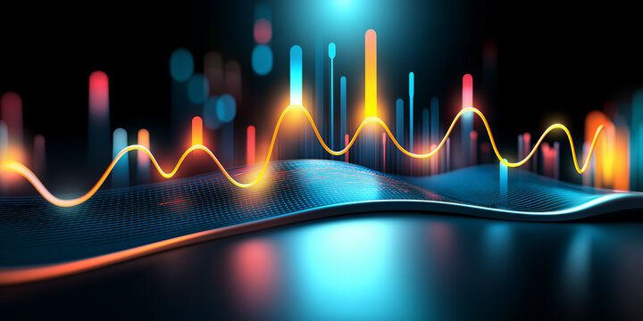 Colorful glowing waveform and bar chart on a futuristic digital interface, symbolizing data flow, analytics, and technology trends