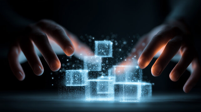 Human hands interact with glowing digital blocks, symbolizing data connection and future innovation