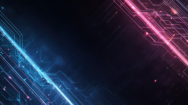 Neon circuit board design with glowing blue and pink lines. Digital background for technology advertisement and futuristic concept.