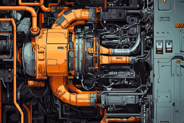 Intricate design of hyperrealistic engine pipes and wires showcases the fusion of engineering and artistry in a dark orange theme
