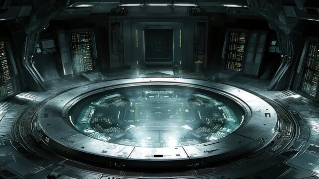 Futuristic spaceship control room; central console; servers; dark; sci-fi background; game design