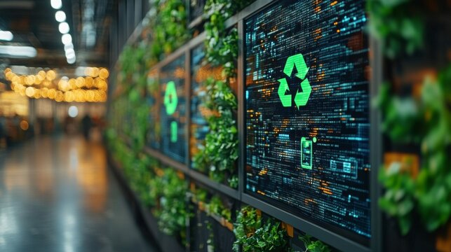close up of digital screen displaying green energy data with plant in foreground, symbolizing sustainability and technology. vibrant colors create modern atmosphere