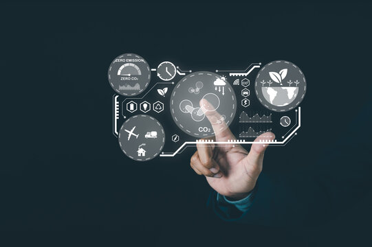 Businessman Interacting with Futuristic Touchscreen Display for Environmental Sustainability and Zero Emission Concept in Dark Setting