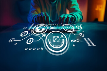 Hands interacting with digital interface, futuristic technology, data visualization, user experience design, business innovation in modern workspace