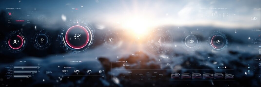 Visual Display of Weather and Environmental Data During Sunset Over a Snowy Landscape