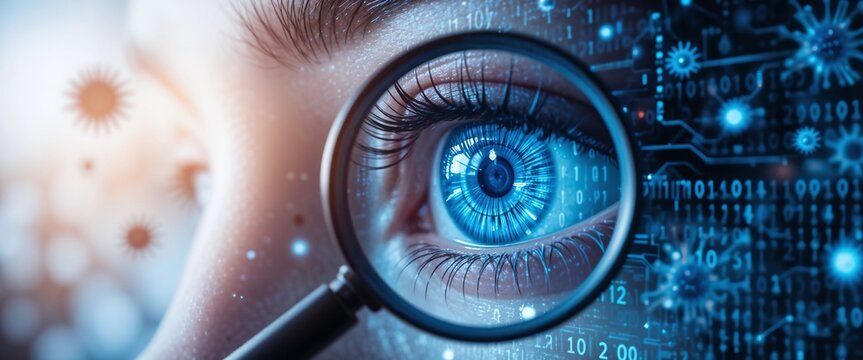 Close-up of a blue eye with a magnifying glass, showcasing a digital data analysis concept with futuristic design elements.