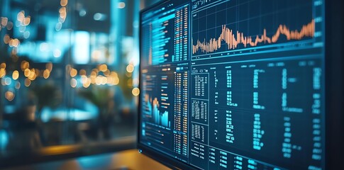 Closeup of a computer screen displaying financial data and charts, with a blurred city lights background.