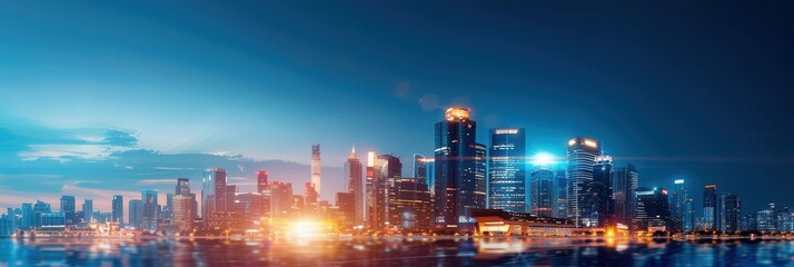 Blurred cityscape with illuminated skyscrapers and financial data overlay, symbolizing stock market trends, urban economy, and investment analysis.