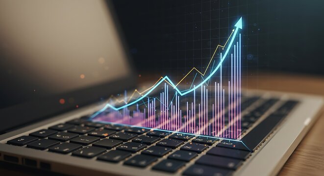 Glowing Chart Overlay on Laptop Keyboard Showing Growth, Digital Finance Concept