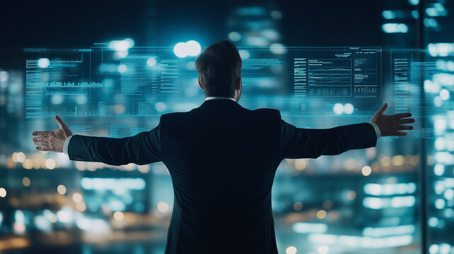 Businessman wearing a suit is analyzing holographic futuristic financial data with an augmented reality interface, overlooking night cityscape with bokeh effect