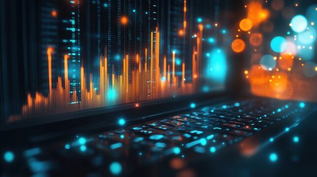 Futuristic Laptop with Data Visualization and Colorful Bokeh Effects