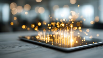 Digital tablet displaying glowing financial graphs and charts with a blurred background and bokeh light effects, laptop with AI checklist