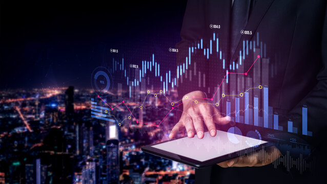 A business professional interacts with a tablet displaying financial graphs over a vibrant cityscape, representing investment opportunities and market analysis. Scalp