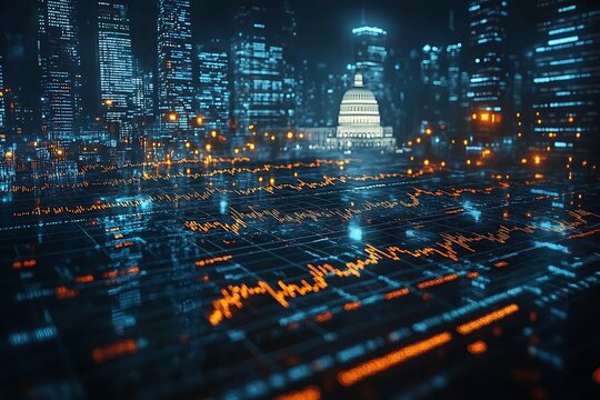 Digital abstract depiction of financial markets displayed over a futuristic cityscape at night