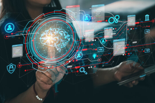 Businesswoman working on laptop, brain hologram with diverse icons