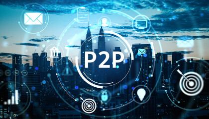 P2P digital finance technology concept with futuristic icons over city skyline at dusk showing modern data exchange and communication network system.