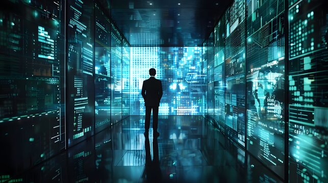 An interior view of a futuristic data center displays real-time financial data