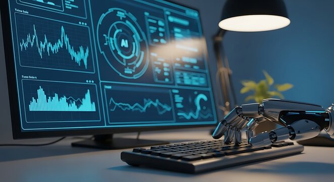 Robotic Hand Interacting with Data Display on a Computer Screen, Futuristic Concept