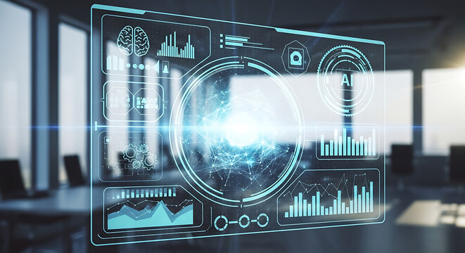 Futuristic holographic interface displaying complex data and analytics in a modern office